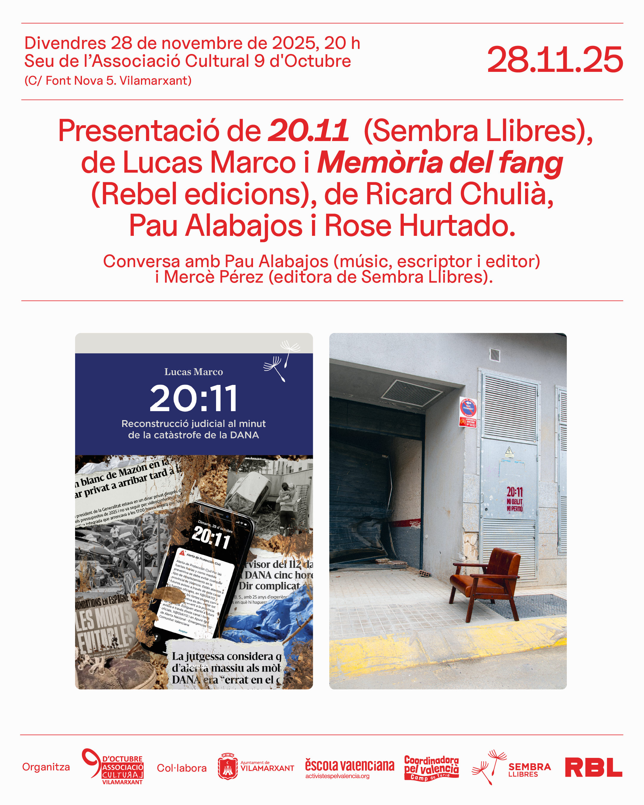 Presentació de 20.11 (Sembra Llibres), de Lucas Marco i Memòria del fang (Rebel edicions), de Ricard Chulià, Pau Alabajos i Rose Hurtado.
